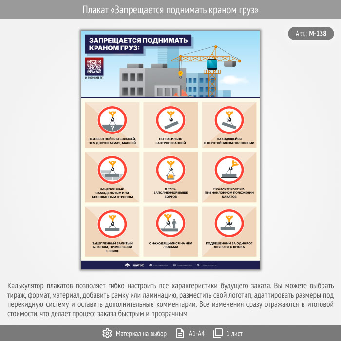 Плакат «Запрещается поднимать краном груз» с QR (М-138, 1 лист) в Новокузнецке купить