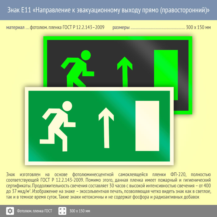 Знак E11 «Направление к эвакуационному выходу прямо (правосторонний)» (фотолюминесцентная пленка ГОСТ 34428-2018, 300х150 мм) в Новокузнецке купить