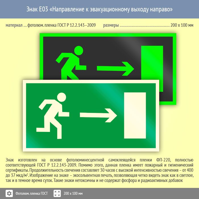 Знак E03 «Направление к эвакуационному выходу направо» (фотолюминесцентная пленка ГОСТ 34428-2018, 200х100 мм) в Новокузнецке купить