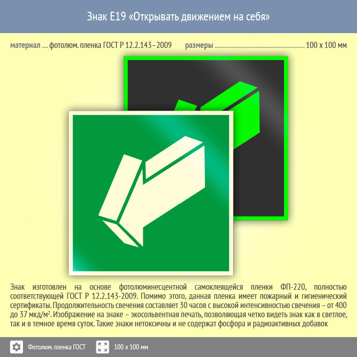 Знак E19 «Открывать движением на себя» (фотолюминесцентная пленка ГОСТ 34428-2018, 100х100 мм) в Новокузнецке купить