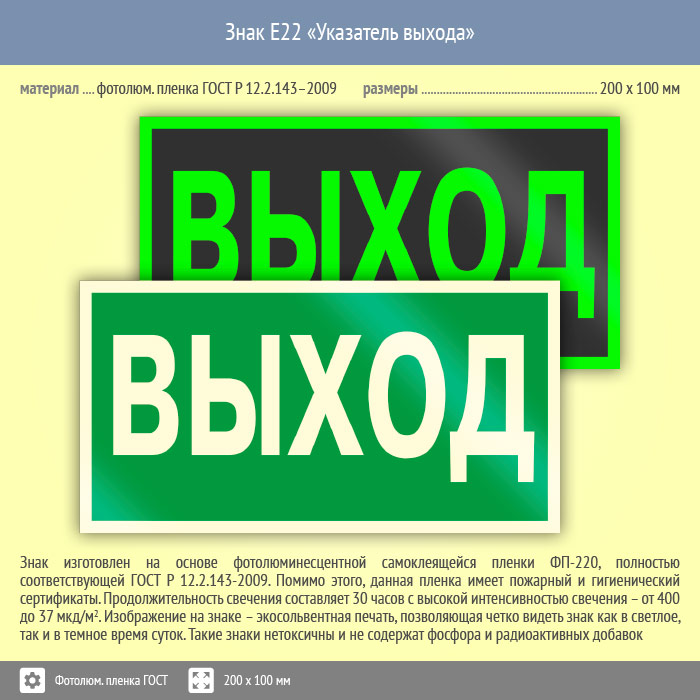 Знак E22 «Указатель выхода» (фотолюминесцентная пленка ГОСТ 34428-2018, 200х100 мм) в Новокузнецке купить