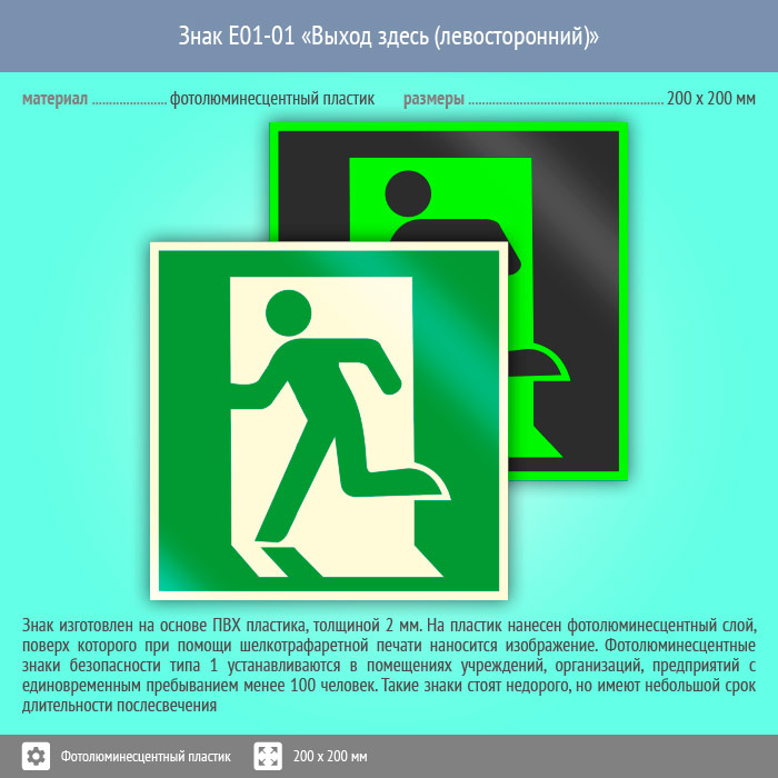 Знак E01-01 «Выход здесь (левосторонний)» (фотолюминесцентный пластик, 200х200 мм) в Новокузнецке купить