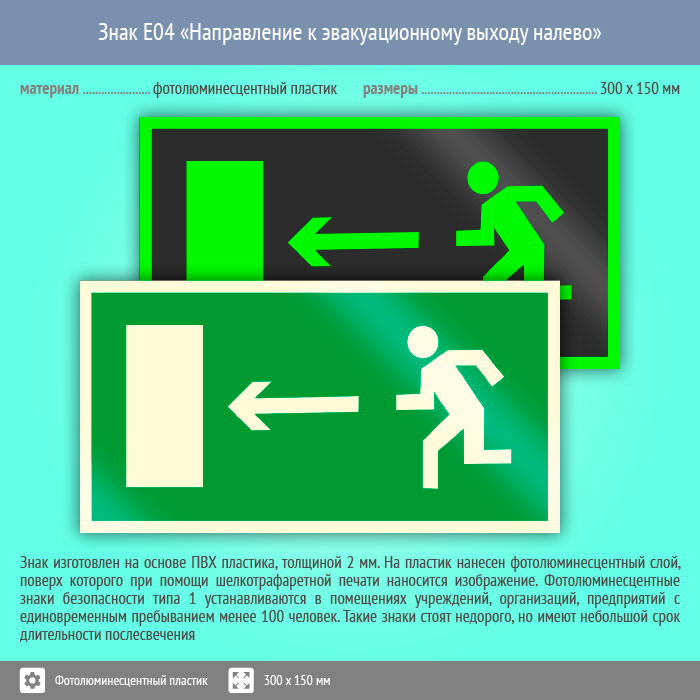 Знак E04 «Направление к эвакуационному выходу налево» (фотолюминесцентный пластик, 300х150 мм) в Новокузнецке купить