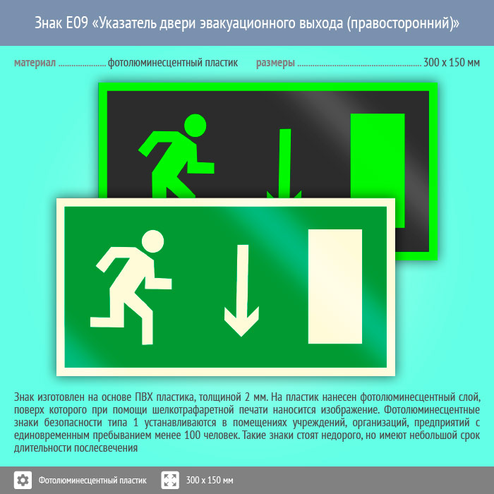 Знак E09 «Указатель двери эвакуационного выхода (правосторонний)» (фотолюминесцентный пластик, 300х150 мм) в Новокузнецке купить
