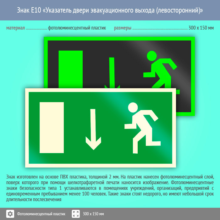 Знак E10 «Указатель двери эвакуационного выхода (левосторонний)» (фотолюминесцентный пластик, 300х150 мм) в Новокузнецке купить
