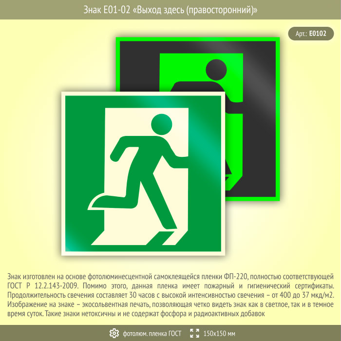 Знак E01-02 «Выход здесь (правосторонний)» (фотолюминесцентная пленка ГОСТ 34428-2018, 150х150 мм) в Новокузнецке купить