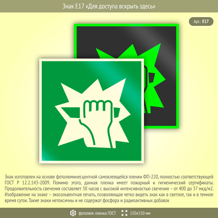 Знак E17 «Для доступа вскрыть здесь» (фотолюминесцентная пленка ГОСТ 34428-2018, 150х150 мм) в Новокузнецке купить