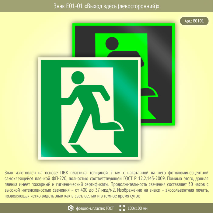 Знак E01-01 «Выход здесь (левосторонний)» (фотолюминесцентный пластик ГОСТ 34428-2018, 100х100 мм) в Новокузнецке купить