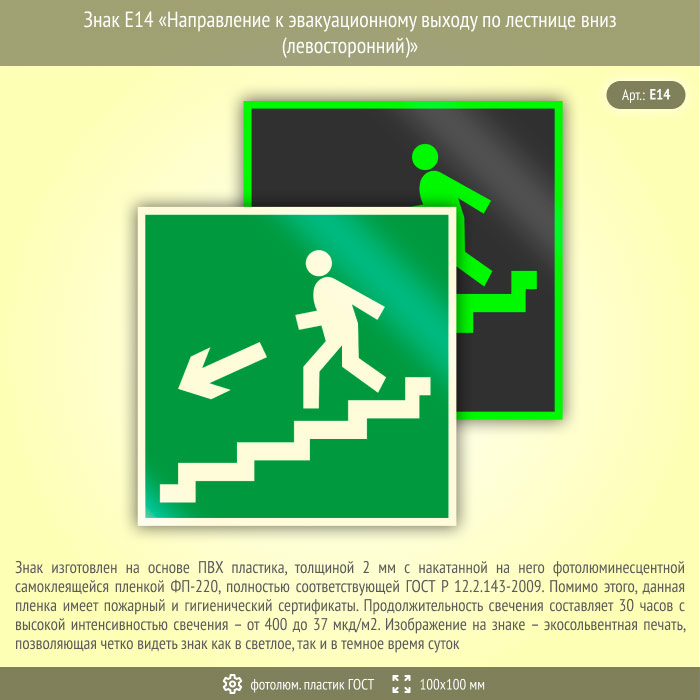 Знак E14 «Направление к эвакуационному выходу по лестнице вниз (левосторонний)» (фотолюминесцентный пластик ГОСТ 34428-2018, 100х100 мм) в Новокузнецке купить