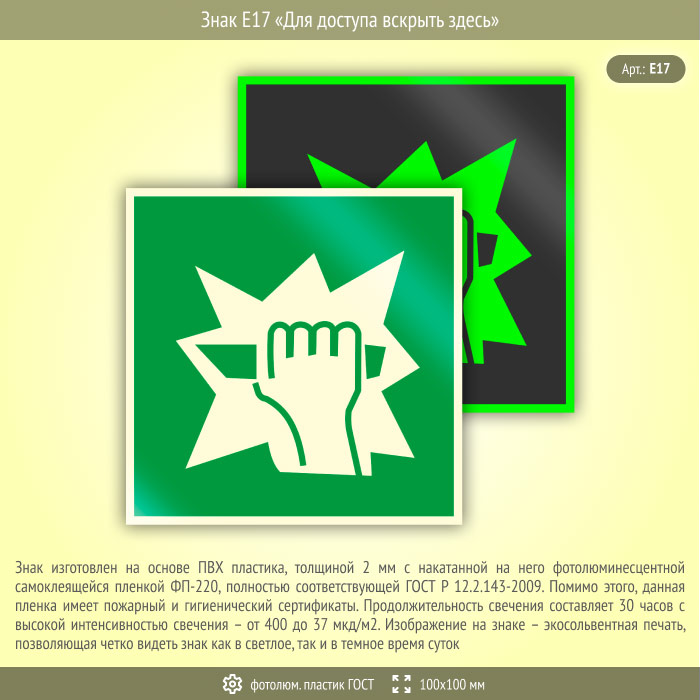 Знак E17 «Для доступа вскрыть здесь» (фотолюминесцентный пластик ГОСТ 34428-2018, 100х100 мм) в Новокузнецке купить