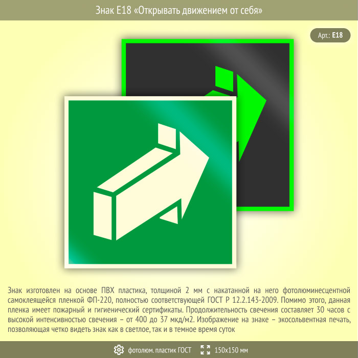 Знак E18 «Открывать движением от себя» (фотолюминесцентный пластик ГОСТ 34428-2018, 150х150 мм) в Новокузнецке купить