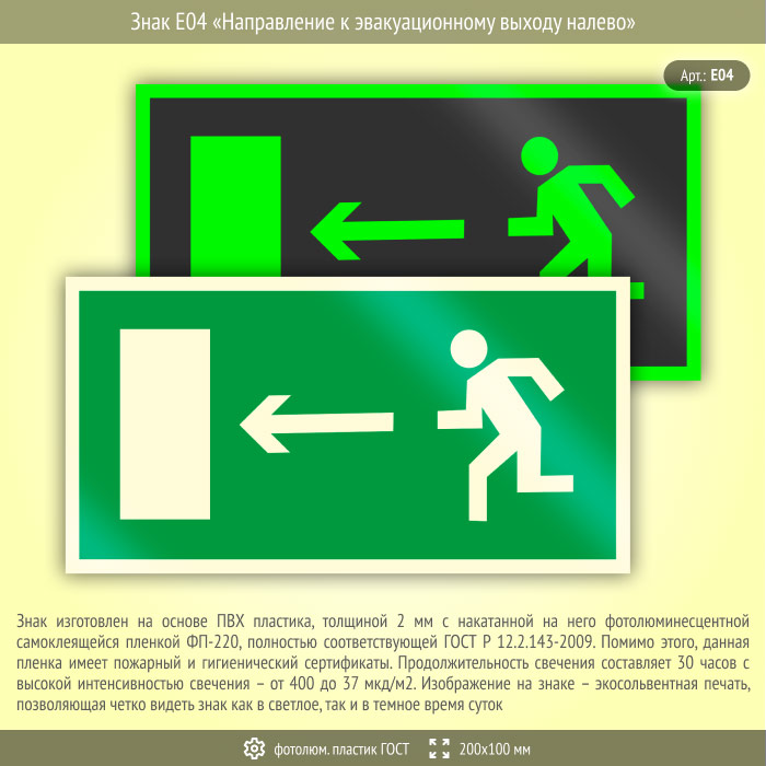 Знак E04 «Направление к эвакуационному выходу налево» (фотолюминесцентный пластик ГОСТ 34428-2018, 200х100 мм) в Новокузнецке купить