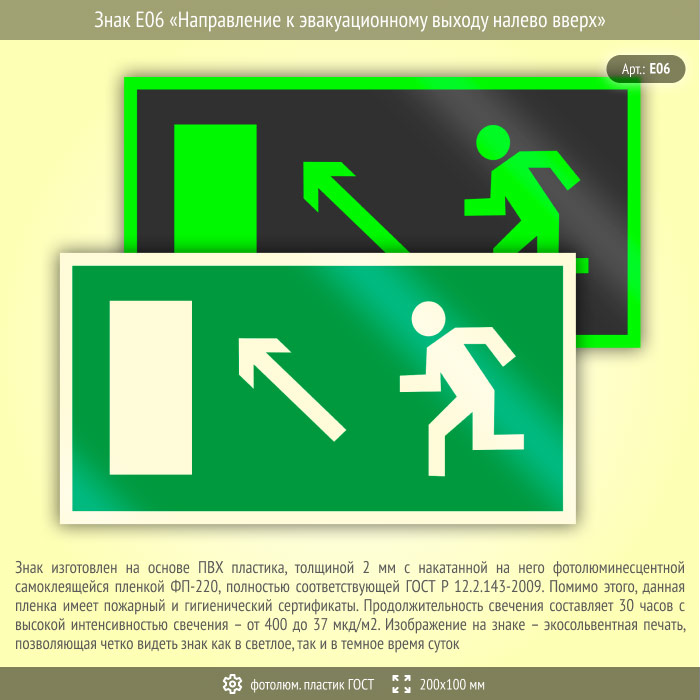 Знак E06 «Направление к эвакуационному выходу налево вверх» (фотолюминесцентный пластик ГОСТ 34428-2018, 200х100 мм) в Новокузнецке купить