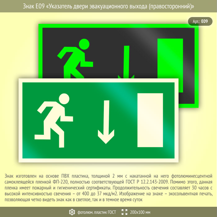 Знак E09 «Указатель двери эвакуационного выхода (правосторонний)» (фотолюминесцентный пластик ГОСТ 34428-2018, 200х100 мм) в Новокузнецке купить