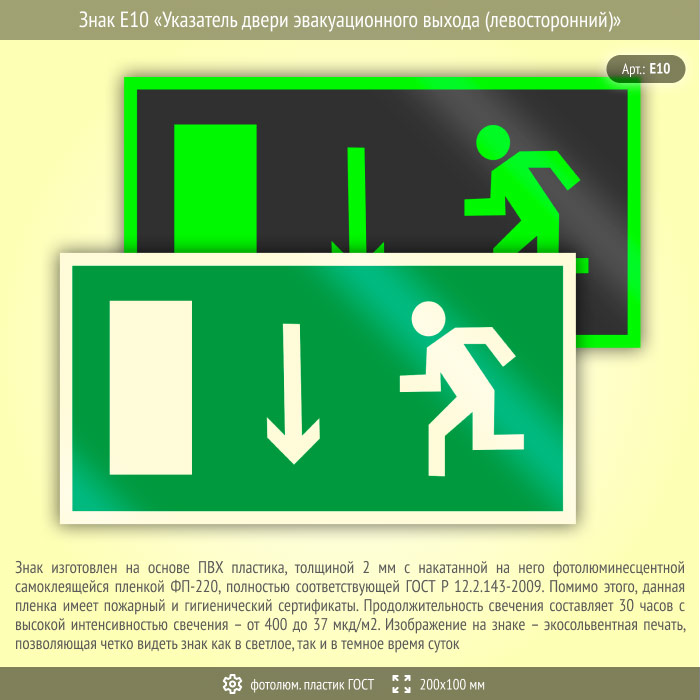 Знак E10 «Указатель двери эвакуационного выхода (левосторонний)» (фотолюминесцентный пластик ГОСТ 34428-2018, 200х100 мм) в Новокузнецке купить