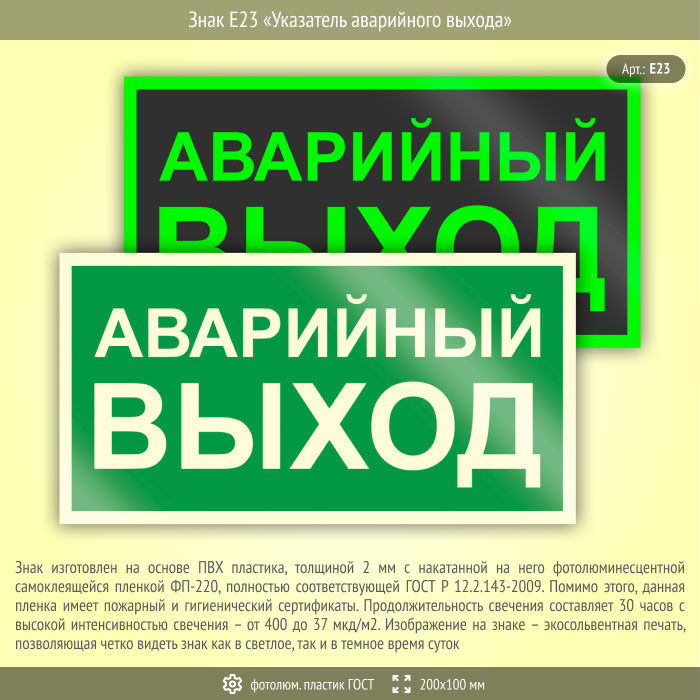 Знак E23 «Указатель аварийного выхода» (фотолюминесцентный пластик ГОСТ 34428-2018, 200х100 мм) в Новокузнецке купить