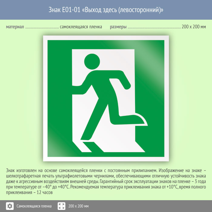 Знак E01-01 «Выход здесь (левосторонний)» (пленка, 200х200 мм) в Новокузнецке купить