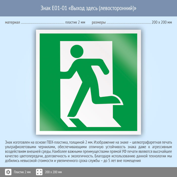 Знак E01-01 «Выход здесь (левосторонний)» (пластик, 200х200 мм) в Новокузнецке купить