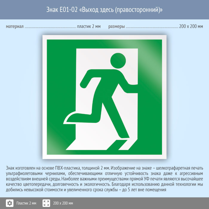 Знак E01-02 «Выход здесь (правосторонний)» (пластик, 200х200 мм) в Новокузнецке купить