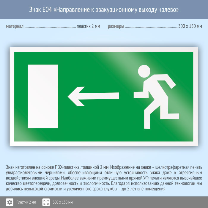 Знак E04 «Направление к эвакуационному выходу налево» (пластик, 300х150 мм) в Новокузнецке купить