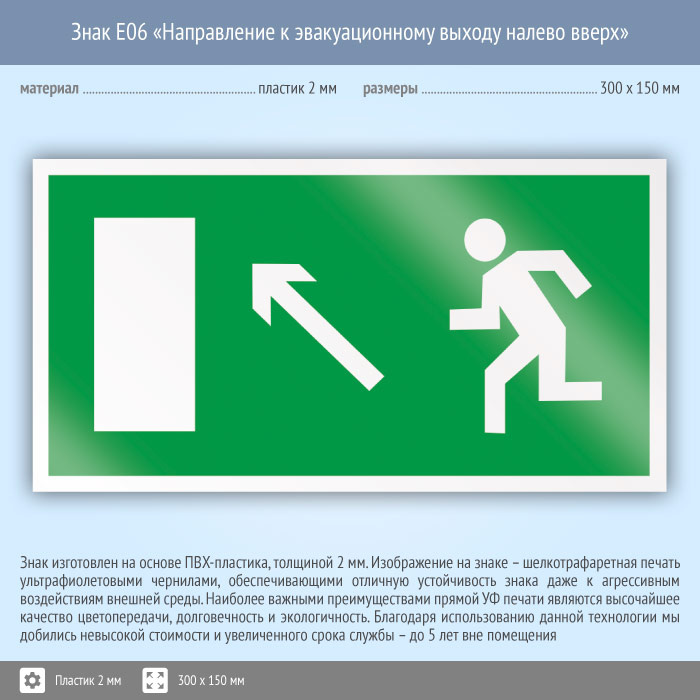 Знак E06 «Направление к эвакуационному выходу налево вверх» (пластик, 300х150 мм) в Новокузнецке купить