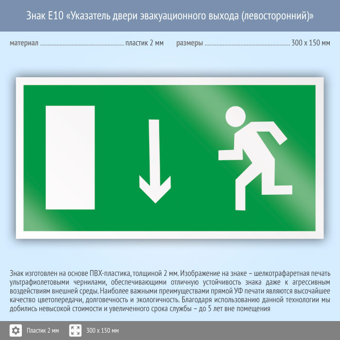 Знак E10 «Указатель двери эвакуационного выхода (левосторонний)» (пластик, 300х150 мм) в Новокузнецке купить