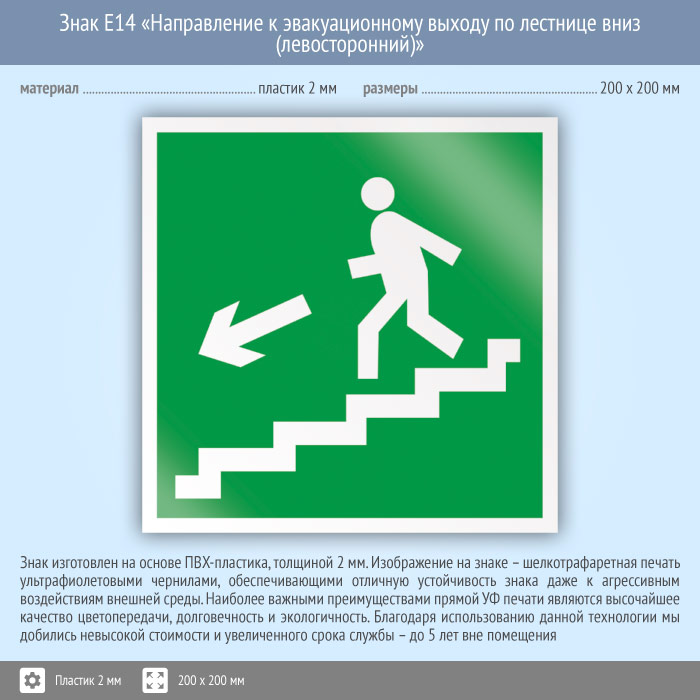 Знак E14 «Направление к эвакуационному выходу по лестнице вниз (левосторонний)» (пластик, 200х200 мм) в Новокузнецке купить