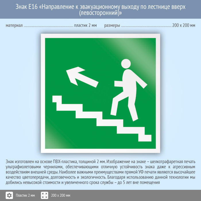 Знак E16 «Направление к эвакуационному выходу по лестнице вверх (левосторонний)» (пластик, 200х200 мм) в Новокузнецке купить