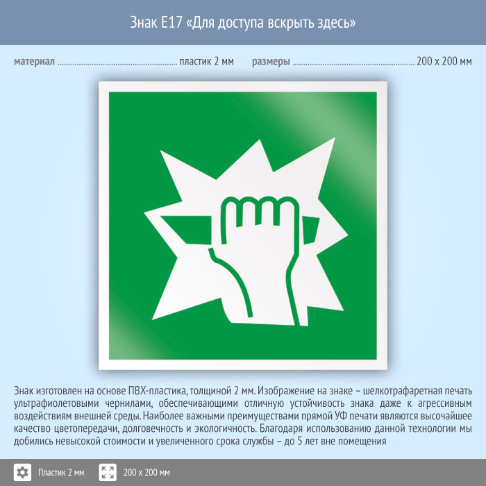 Знак E17 «Для доступа вскрыть здесь» (пластик, 200х200 мм) в Новокузнецке купить