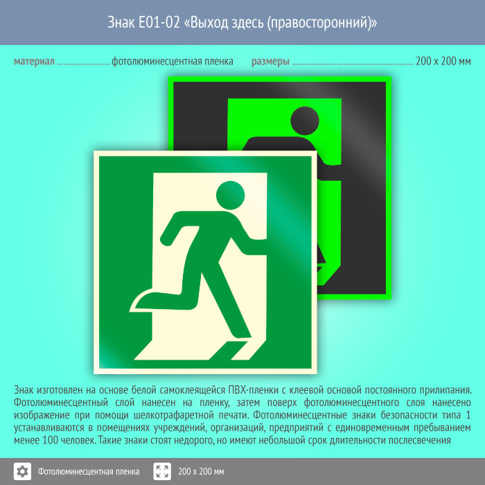 Знак E01-02 «Выход здесь (правосторонний)» (фотолюминесцентная пленка, 200х200 мм) в Новокузнецке купить