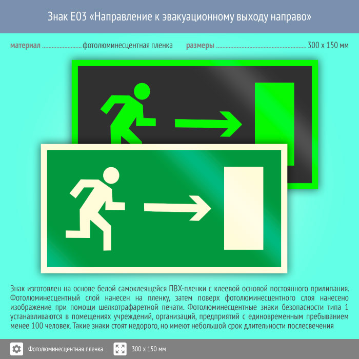 Знак E03 «Направление к эвакуационному выходу направо» (фотолюминесцентная пленка, 300х150 мм) в Новокузнецке купить