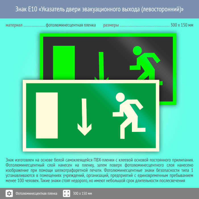 Знак E10 «Указатель двери эвакуационного выхода (левосторонний)» (фотолюминесцентная пленка, 300х150 мм) в Новокузнецке купить