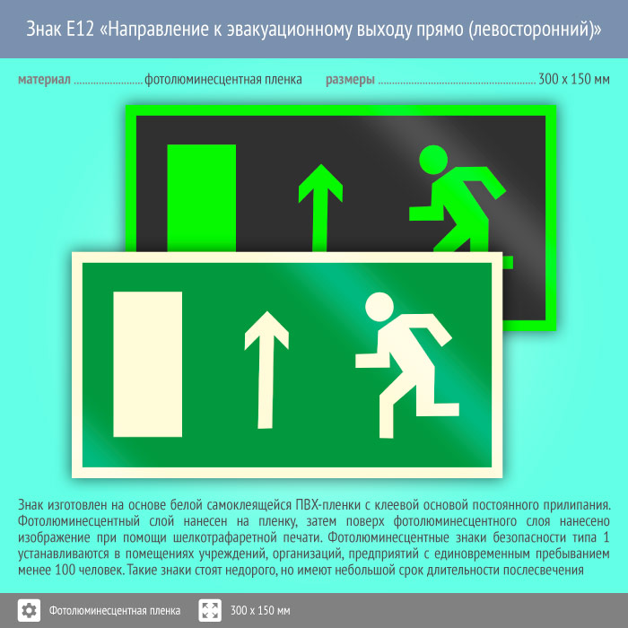 Знак E12 «Направление к эвакуационному выходу прямо (левосторонний)» (фотолюминесцентная пленка, 300х150 мм) в Новокузнецке купить