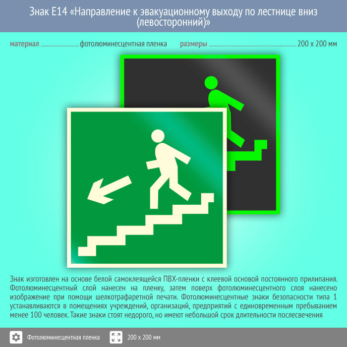 Знак E14 «Направление к эвакуационному выходу по лестнице вниз (левосторонний)» (фотолюминесцентная пленка, 200х200 мм) в Новокузнецке купить