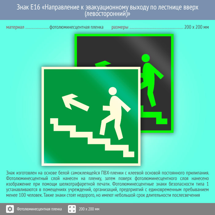 Знак E16 «Направление к эвакуационному выходу по лестнице вверх (левосторонний)» (фотолюминесцентная пленка, 200х200 мм) в Новокузнецке купить