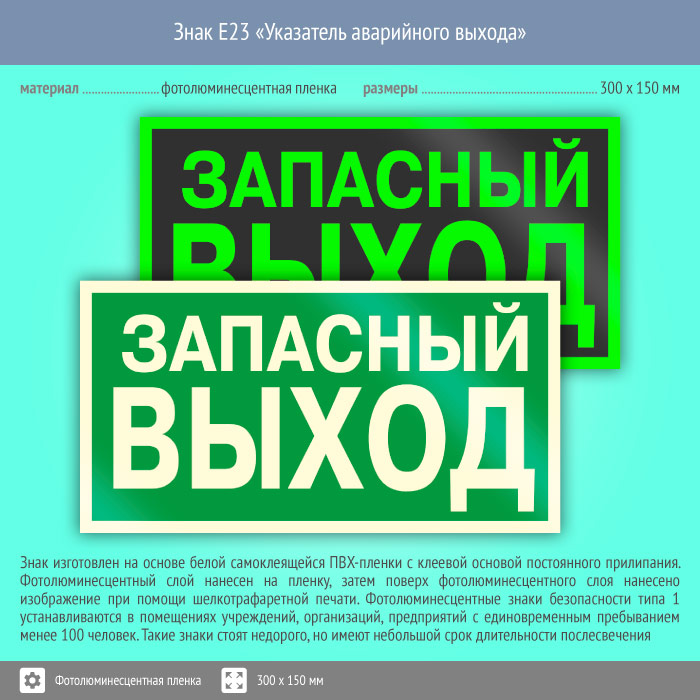 Знак E23 «Указатель запасного выхода» (устаревший) (фотолюминесцентная пленка, 300х150 мм) в Новокузнецке купить