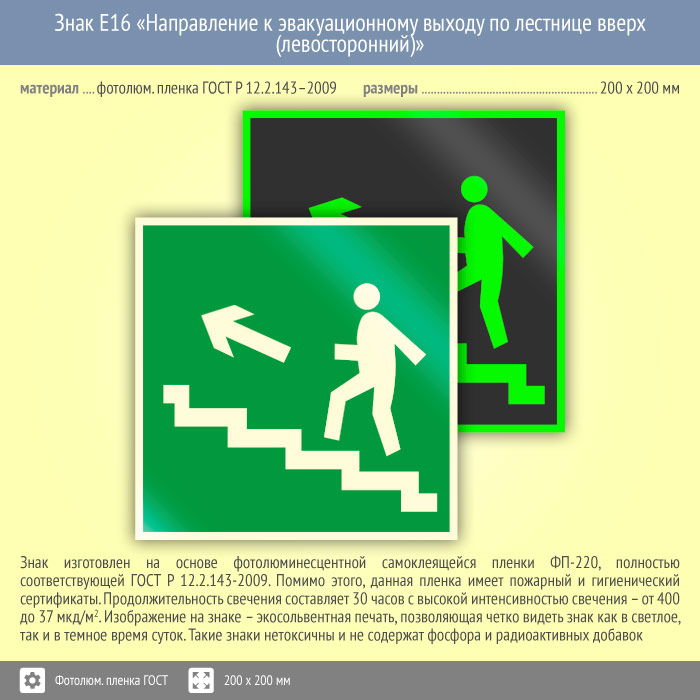 Знак E16 «Направление к эвакуационному выходу по лестнице вверх (левосторонний)» (фотолюминесцентная пленка ГОСТ 34428-2018, 200х200 мм) в Новокузнецке купить