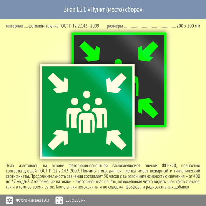 Знак E21 «Пункт (место) сбора» (фотолюминесцентная пленка ГОСТ 34428-2018, 200х200 мм) в Новокузнецке купить