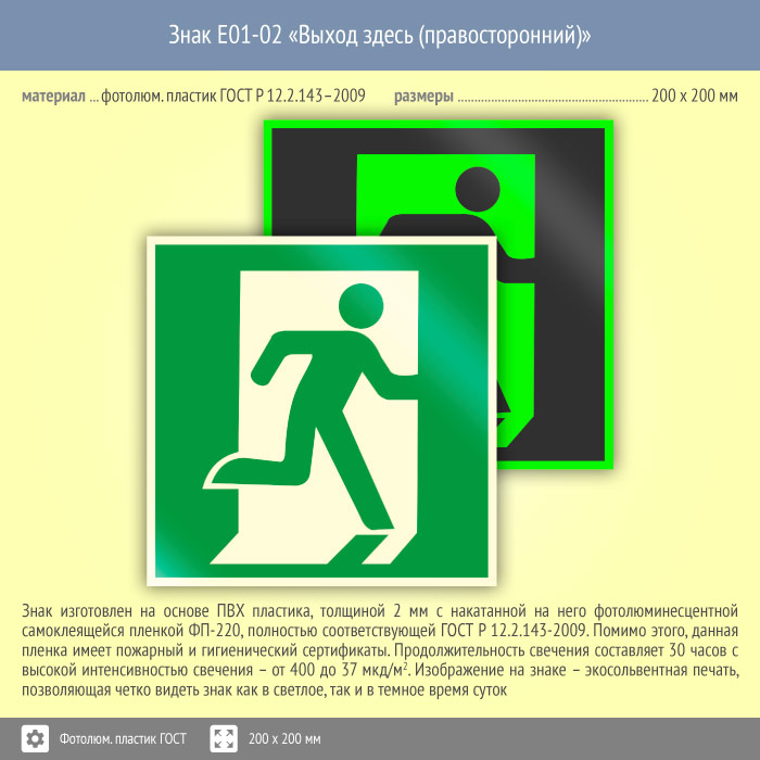 Знак E01-02 «Выход здесь (правосторонний)» (фотолюминесцентный пластик ГОСТ 34428-2018, 200х200 мм) в Новокузнецке купить
