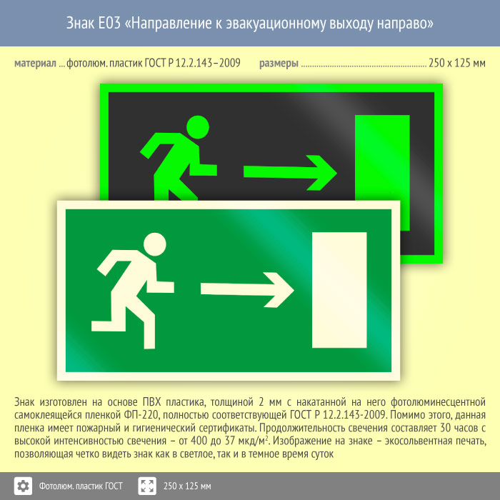 Знак E03 «Направление к эвакуационному выходу направо» (фотолюминесцентный пластик ГОСТ 34428-2018, 250х125 мм) в Новокузнецке купить