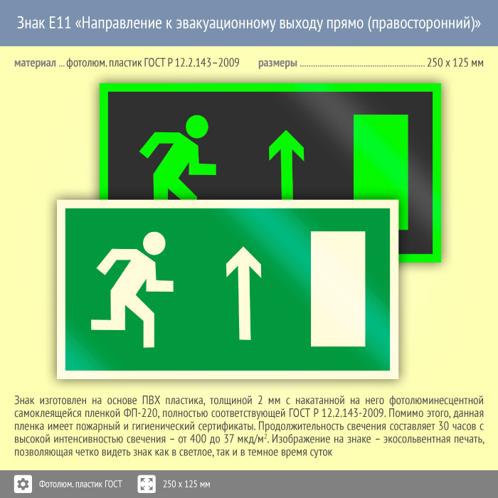 Знак E11 «Направление к эвакуационному выходу прямо (правосторонний)» (фотолюминесцентный пластик ГОСТ 34428-2018, 250х125 мм) в Новокузнецке купить