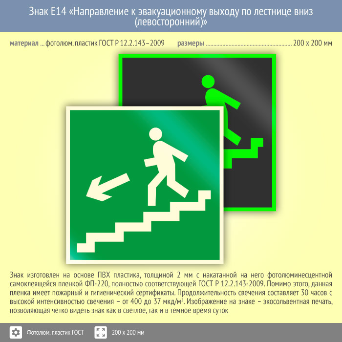 Знак E14 «Направление к эвакуационному выходу по лестнице вниз (левосторонний)» (фотолюминесцентный пластик ГОСТ 34428-2018, 200х200 мм) в Новокузнецке купить