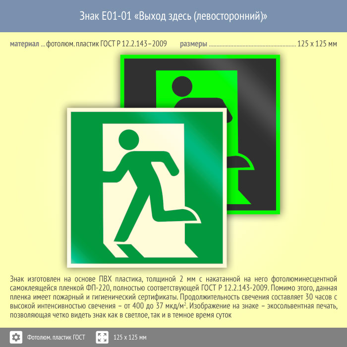 Знак E01-01 «Выход здесь (левосторонний)» (фотолюминесцентный пластик ГОСТ 34428-2018, 125х125 мм) в Новокузнецке купить