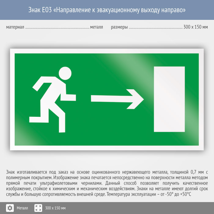 Знак E03 «Направление к эвакуационному выходу направо» (металл, 300х150 мм) в Новокузнецке купить