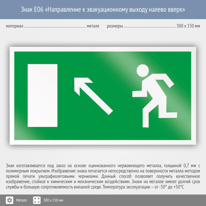 Знак E06 «Направление к эвакуационному выходу налево вверх» (металл, 300х150 мм) в Новокузнецке купить
