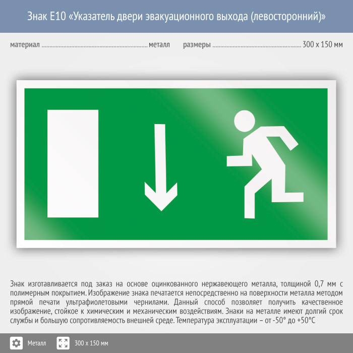 Знак E10 «Указатель двери эвакуационного выхода (левосторонний)» (металл, 300х150 мм) в Новокузнецке купить
