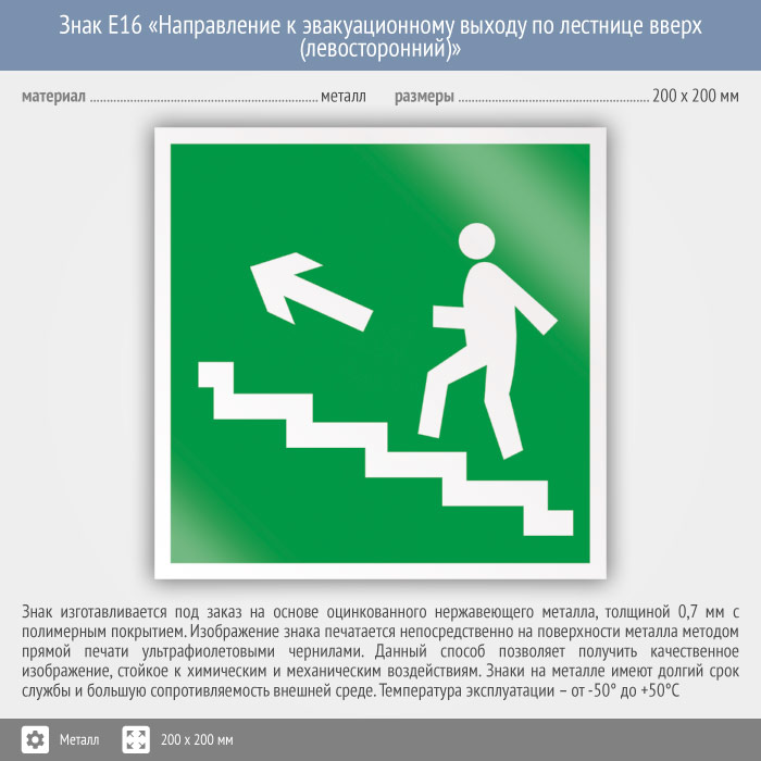 Знак E16 «Направление к эвакуационному выходу по лестнице вверх (левосторонний)» (металл, 200х200 мм) в Новокузнецке купить