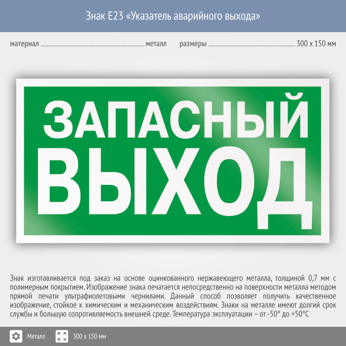 Знак E23 «Указатель запасного выхода» (устаревший) (металл, 300х150 мм) в Новокузнецке купить
