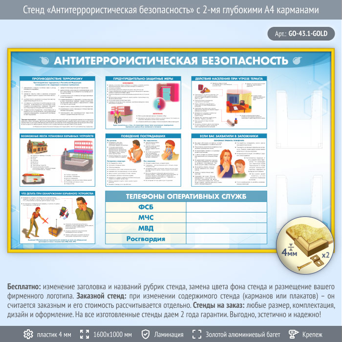 Стенд «Антитеррористическая безопасность» с 2-мя глубокими А4 карманами (GO-43.1-GOLD) в Новокузнецке купить