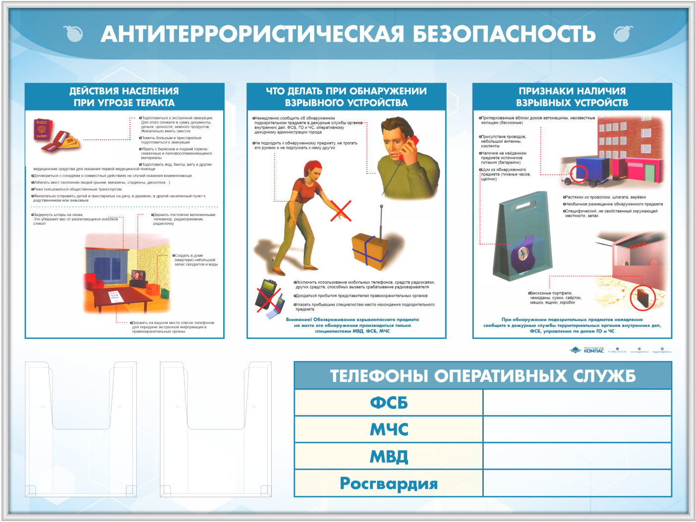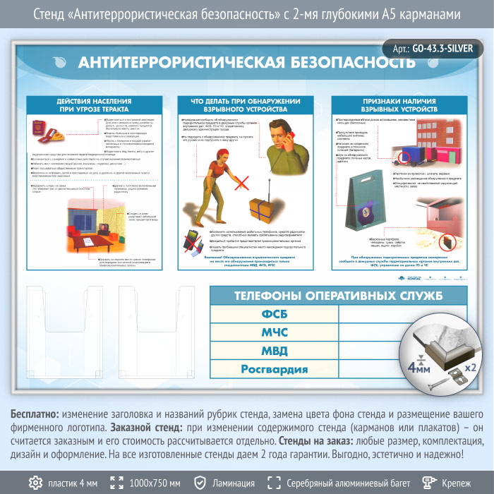 Стенд «Антитеррористическая безопасность» с 2-мя глубокими А5 карманами (GO-43.3-SILVER) в Новокузнецке купить